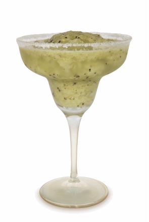 Em um liquidificador, colocar as frutas congeladas e o gelo. Bater essa mistura na menor velocidade, até triturar bem a mistura.
