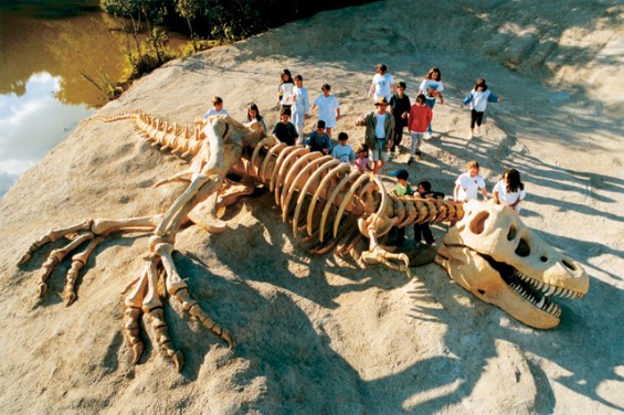 Parque paleontológico com fósseis de todos os tamanhos e um enorme Tiranossauro Rex.