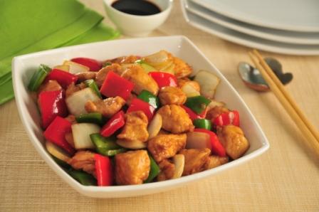 Frite o frango até estar quase no ponto. Acrescente o pimentão e a cebola até atingir o ponto ideal, e escorra tudo. Na panela vazia, acrescente meio copo americano de água e molho shoyu a gosto, com uma pitada de glutamato de monossódio e açúcar, deixando sempre a maisena dissolvida por último. Retorne aos ingredientes escorridos e mexa bem. Acrescente a maisena para engrossar e está pronto. Coloque na travessa e salpique o amendoim por cima.